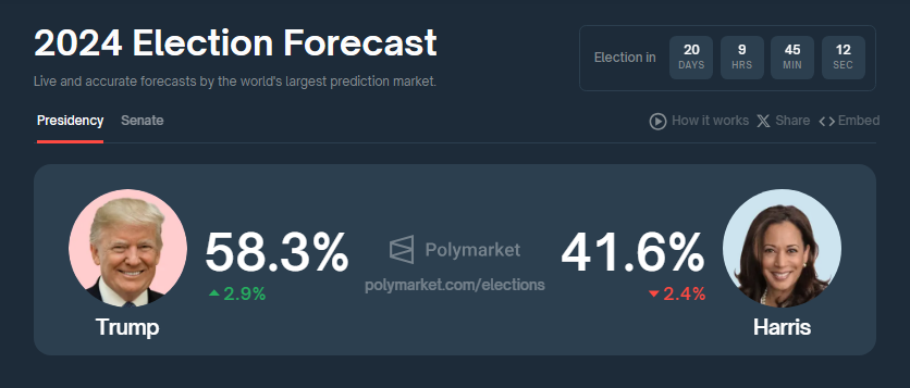 The approaching US presidential election is also driving Bitcoin’s surge. Prediction markets today reflect a change favoring Republican candidate Donald Trump, who is pro-crypto, over Democratic Vice President Kamala Harris. Based on Polymarket’s betting statistics, consumers think Trump has a 58% chance of winning, therefore clearly surpassing Harris.