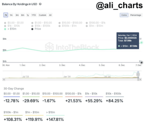 Interestingly, on-chain data shows the surge in whale accumulation didn’t just start yesterday. IntoTheBlock’s Balance By Holdings In USD metric shows a 30-day increase of 147.81% in the holdings of addresses holding more than $10 million worth of PEPE tokens. These large holders have been on an accumulation trend, with a massive $1.14 billion purchase coming in on December 7 alone.