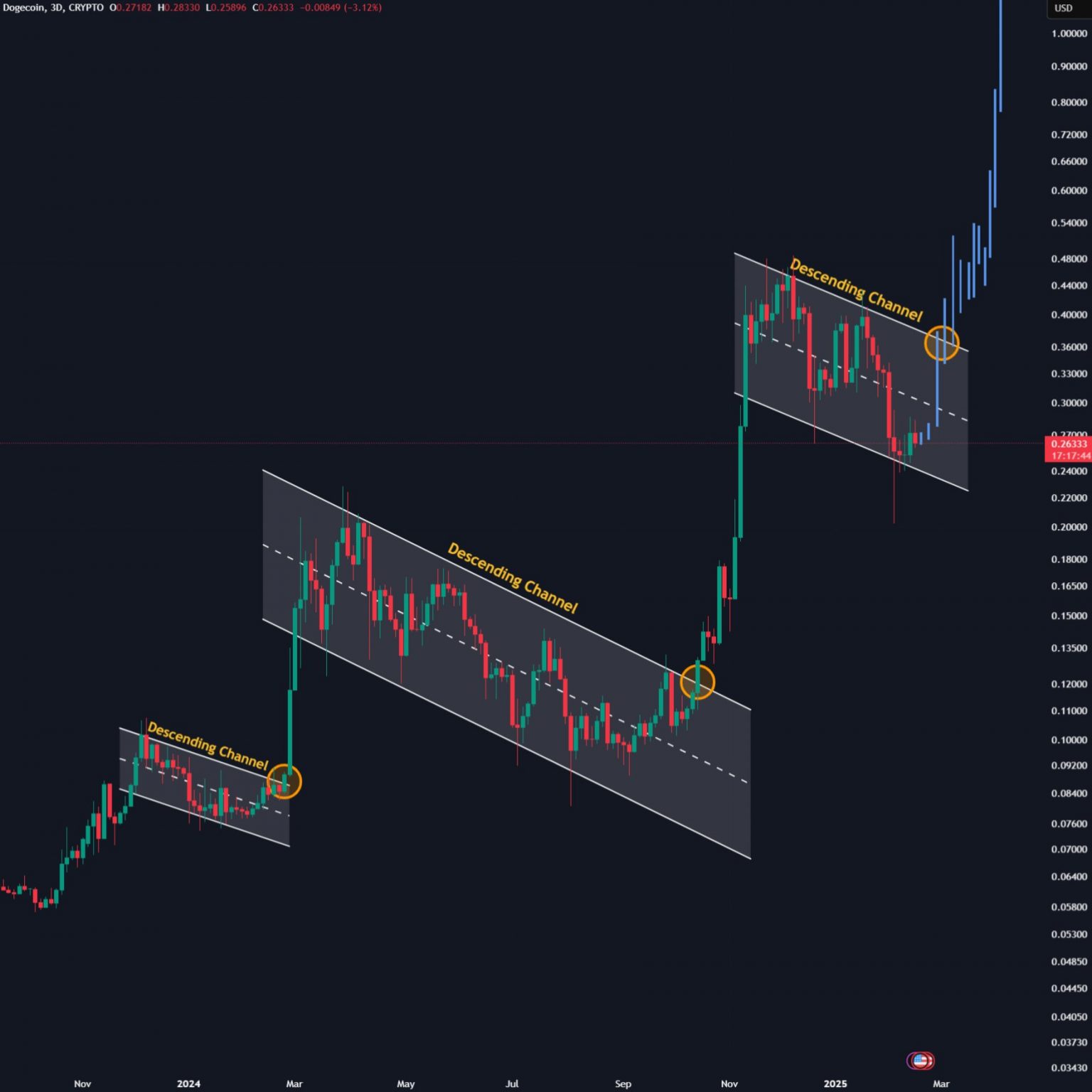 Now, Abbé points out that Dogecoin appears to be mirroring those past setups, trading within what he identifies as a “bullish descending channel.” Price action on the 3-day timeframe shows Dogecoin bouncing between parallel trendlines that slope downward from roughly $0.36 at their highest to around $0.24 at their lowest.
