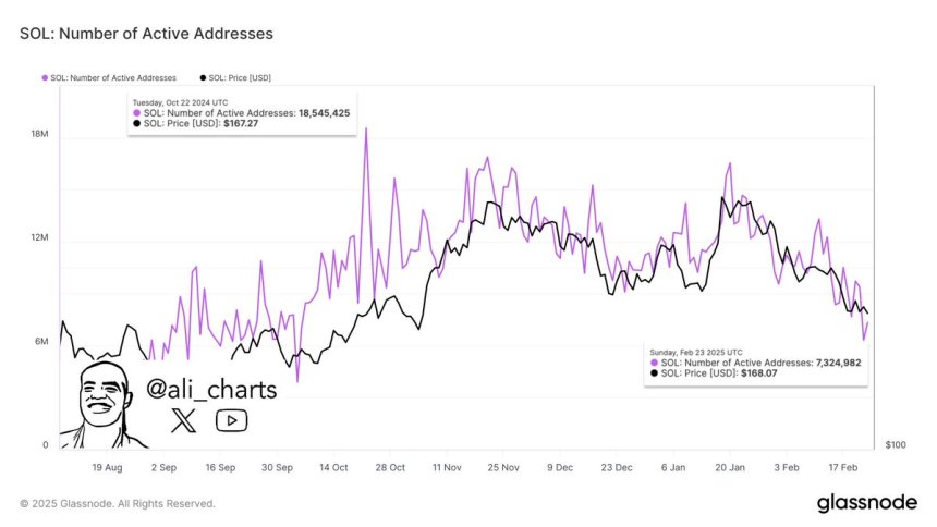 The bearish sentiment surrounding Solana is further underscored by a stark drop in network activity. Martinez pointed out that Solana’s active addresses have plummeted by 60%, falling from an impressive all-time high of 18.5 million in October to just 7.3 million.