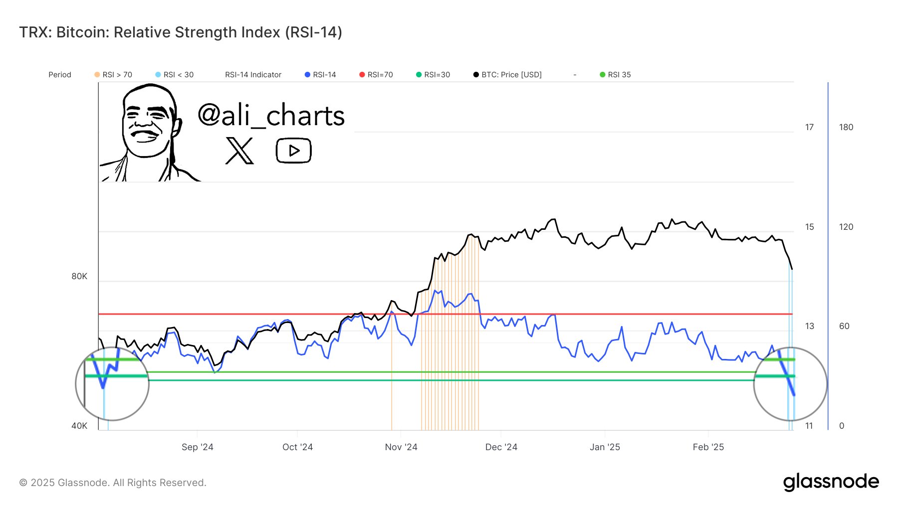 According to an X post by seasoned crypto analyst Ali Martinez, BTC has entered oversold conditions it hadn’t seen since August 2024. Specifically, the Relative Strength Index (RSI) for Bitcoin has dropped to the lowest level in the last seven months.