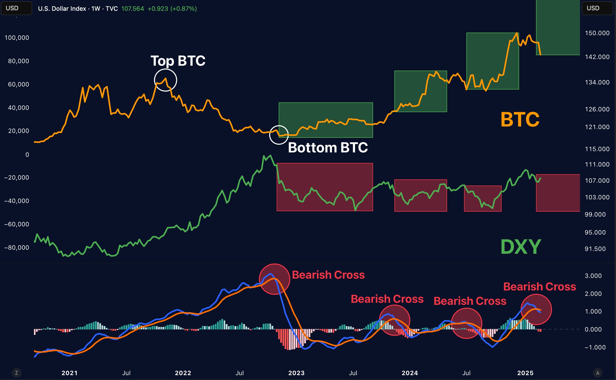 In an X post, the analyst noted that whenever the DXY Moving Average Convergence Divergence (MACD) has turned bearish, BTC has rallied. The analyst illustrated this with the following chart.