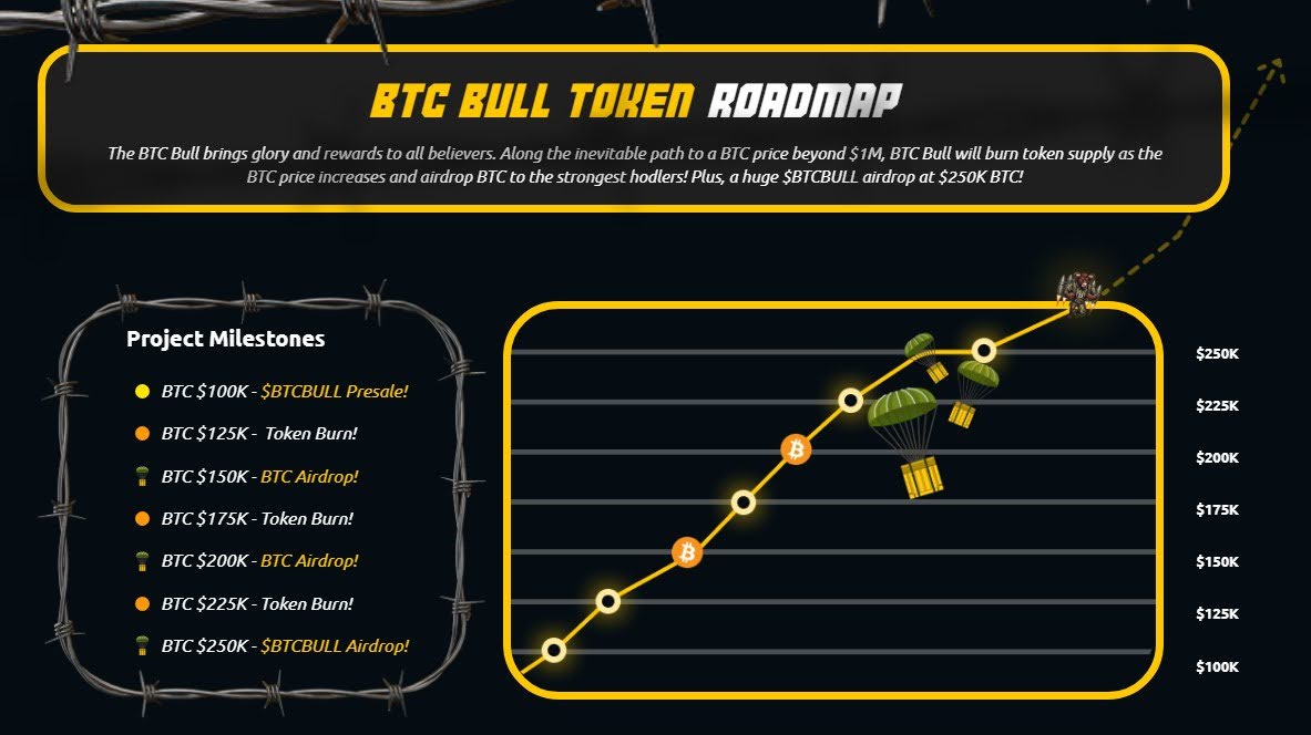 Once Bitcoin reaches $250,000, the roadmap will conclude with a massive BTC Bull Token airdrop split among all holders. However, the project’s developers believe that BTC is on an “inevitable path” to $1 million, which could result in an expansion of the roadmap once the leading cryptocurrency crosses the $250,000 mark.