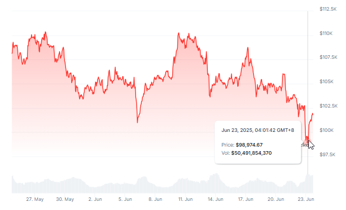 Bitcoin briefly slid to $98,974 late on Sunday after US airstrikes targeted Iranian nuclear facilities. That was its weakest point since early May.