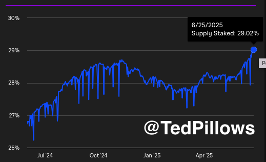 Top analyst Ted Pillows highlighted a major on-chain development: the percentage of Ethereum supply being staked has reached a new all-time high. This milestone signals rising confidence among long-term holders and validators, who are increasingly locking up ETH to secure the network and earn yield. Elevated staking levels historically coincide with lower active supply and reduced sell pressure—an encouraging sign for bulls anticipating a breakout.