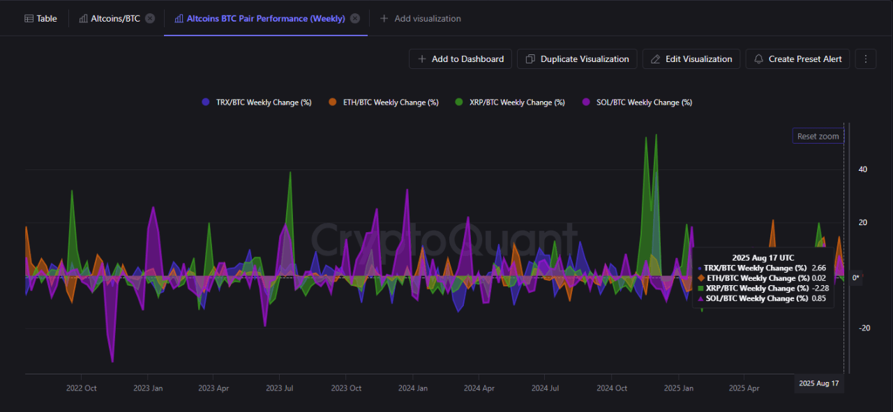 According to data shared by CryptoQuant contributor Crazzyblockk, TRON has outpaced other major altcoins in weekly BTC pair performance.