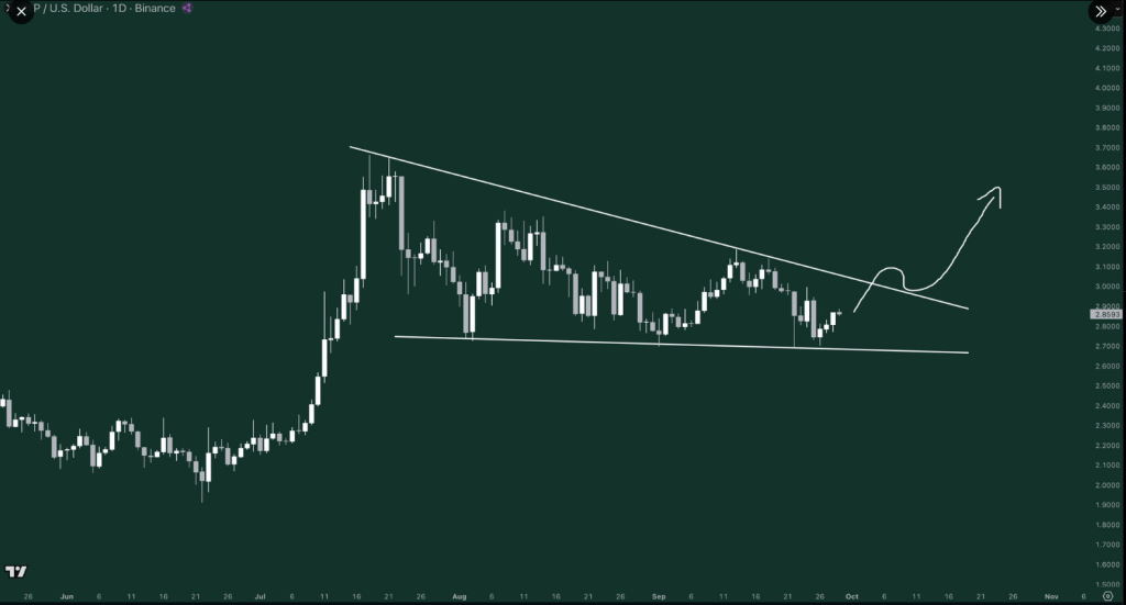 Short-term charts show XRP compressing after a slide that began in July when the token crossed $3.60. Based on reports, Gordon’s shared chart points to prices tightening toward a breakout point.