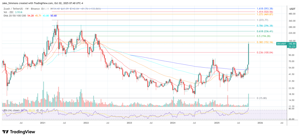 Zcash (ZEC) has staged one of the sharpest recoveries of the quarter, vaulting roughly 160%–170% from late-September levels and briefly trading in the low-$150s on October 2 after spending much of 2024 and early 2025 suppressed in the $16–$20 corridor.