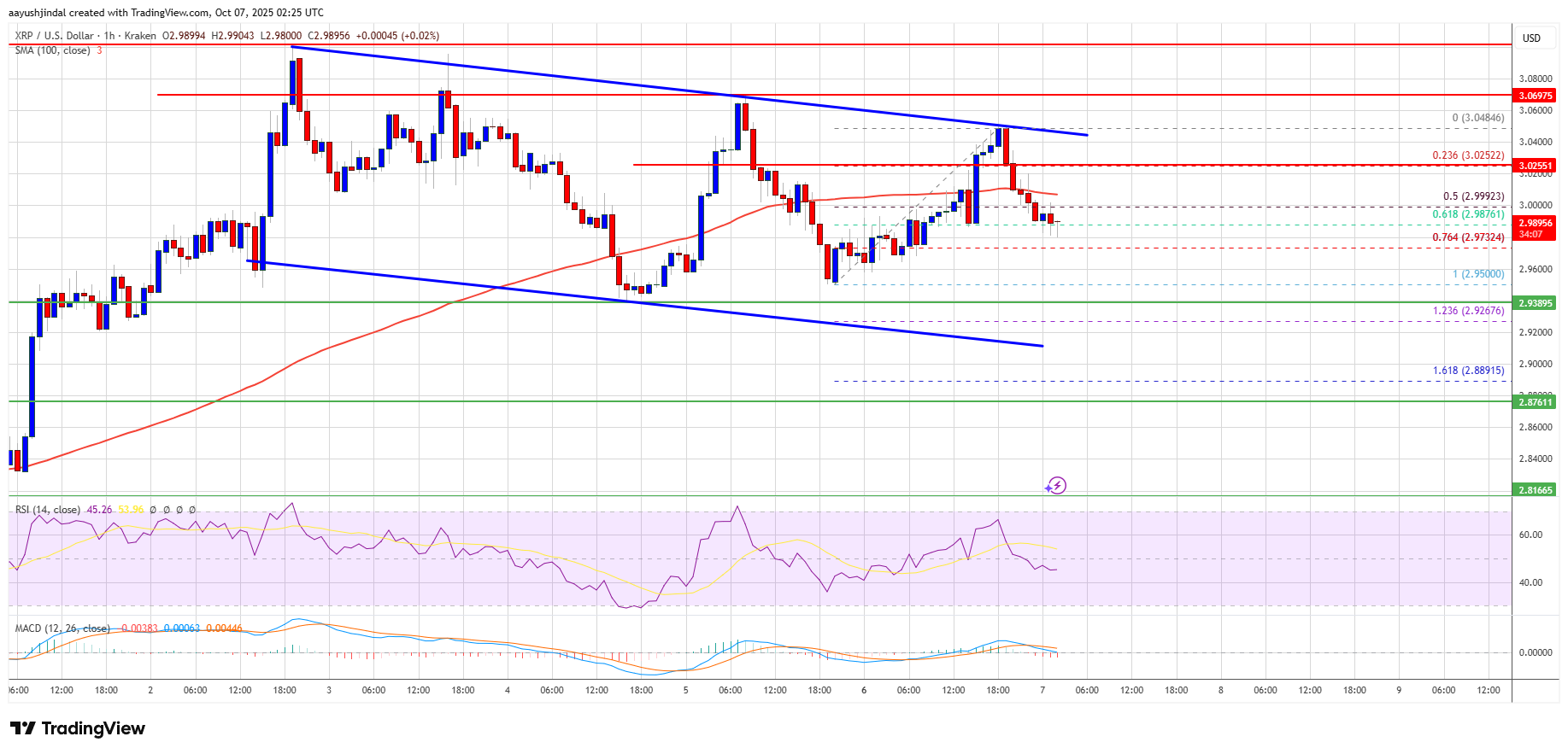 • XRP price is slowly moving lower below the $3.00 pivot zone.