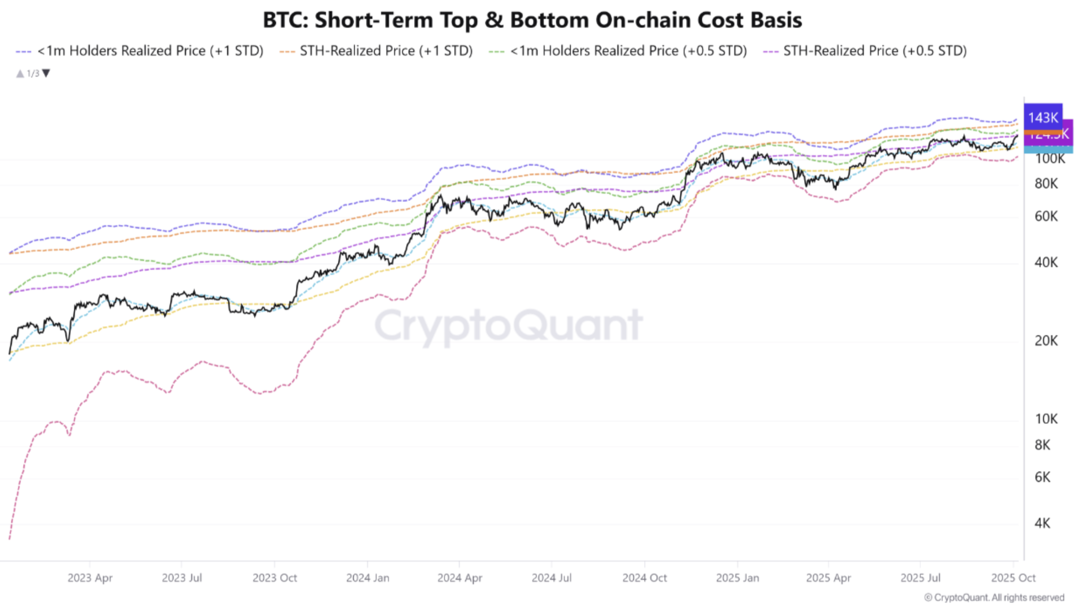 Similarly, the <1 month Holders Realized Price, 0.5 Standard Deviation, is currently around $133,239. Meanwhile, the STH-Realized Price, +1 Standard Deviation, currently sits at $131,310.