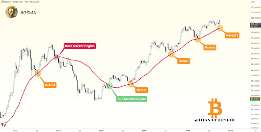 Crypto analyst Titan of Crypto assured that the bull market is not yet, indicating more upside for the Bitcoin price. The analyst explained that the bull market starts when BTC reclaims its 50 SMA and that the bear market starts when it loses it. The flagship crypto also achieved a weekly candle close above $112,000, which confirmed Titan of Crypto’s thesis.