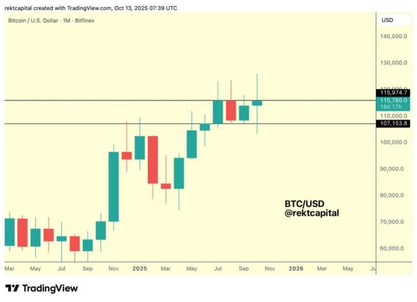 He also noted that Bitcoin has been consolidating within the $108,000-$116,000 levels in the monthly timeframe, upside wicking beyond the range high and downside wicking below the range low since July.
