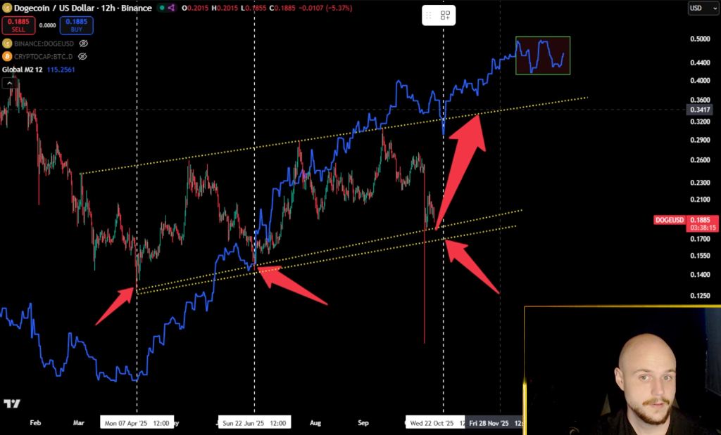 The case rests on a recurring confluence he has been tracking for months: Dogecoin tagging a channel support trendline while the daily RSI presses into oversold, followed by improvement in his macro read on M2 turning bullish into month-end.