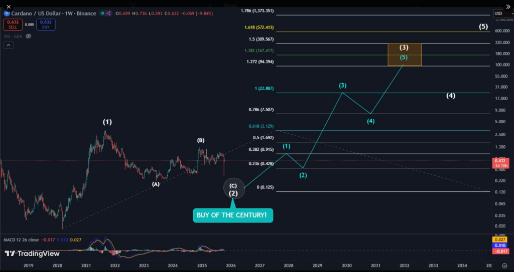 According to Mr. Brownstone, Cardano could offer a once-in-a-lifetime buying chance if price action follows a specific pattern. He highlighted sniper entry points and sketched a five-wave move that would, on his chart, lift ADA into three-digit territory.