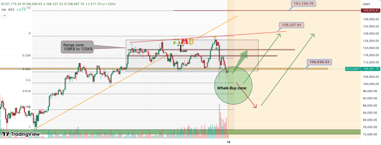 Despite the decline below $108,000, crypto analyst MMBTrader tells investors that this may not be the best time to actually buy the cryptocurrency. Instead, they advise that investors wait to buy ‘cheap’ Bitcoin at the levels when the whales will be likely to start buying the cryptocurrency again. This whale buy zone is placed below $90,000 and could be as low as $87,000 before support is established.