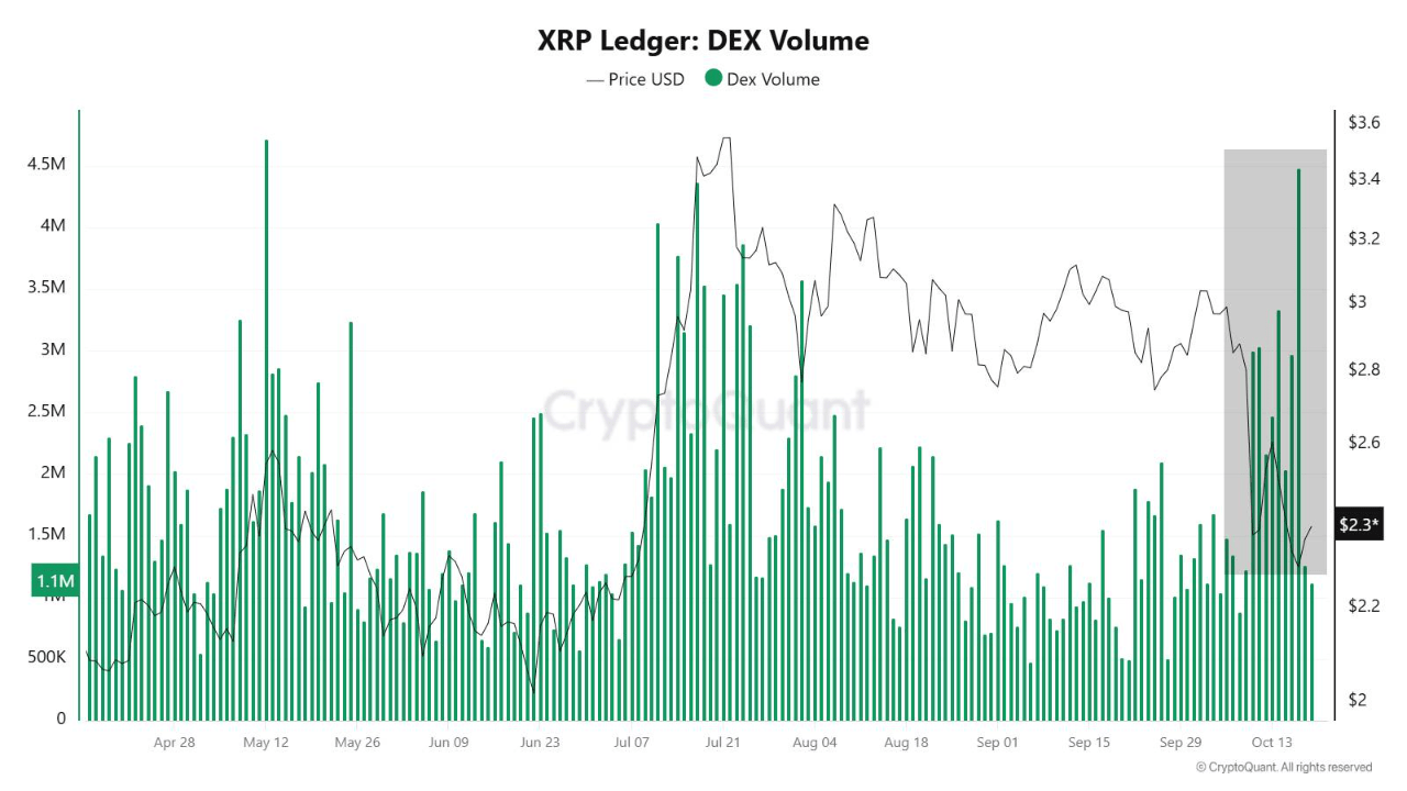 According to data shared by CryptoQuant analyst CryptoOnchain, the XRP Ledger’s decentralized exchange (DEX) has shown a striking divergence between price and activity. Between October 8th and 17th, as XRP’s price plunged from around $3.0 to $2.3, DEX trading volume spiked to a multi-month high. This surge in activity, highlighted in the greyed-out region of the chart, signals that despite price weakness, on-chain engagement remains robust.