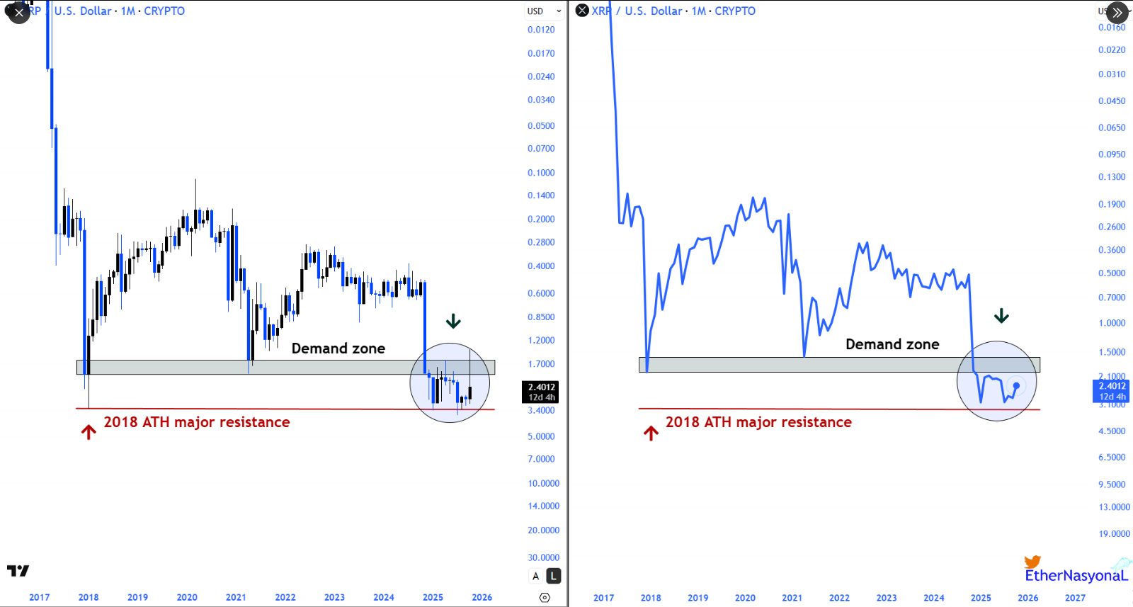 Technical calls are mixed. Ether Nasyonal, a crypto analyst, told followers that XRP is “cooking something” on the 1-month chart and highlighted an important demand zone.