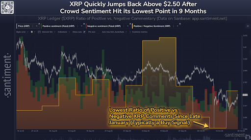 Santiment’s latest data reveals that XRP’s recovery from its flash crash lows around $1.90 to $2.20, and then towards $2.50, has unfolded in tandem with one of the most intense waves of negative sentiment recorded this year. Notably, the platform’s crowd sentiment ratio reached its lowest level since January, reflecting the extreme point of pessimism among traders.