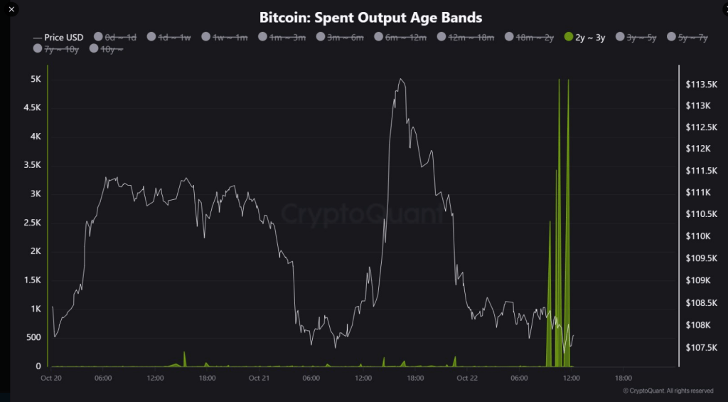 According to CryptoQuant analyst JA Maartun, exactly 15,965 BTC that had been idle for about three years were shifted earlier in the day. The coins moved while Bitcoin traded below $110,000, and at roughly $108,000 a coin the batch is worth about $1.724 billion.