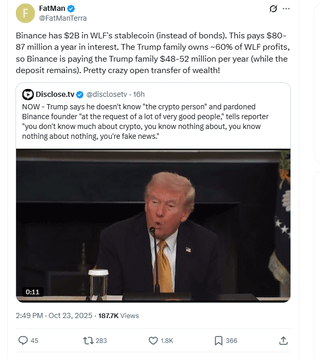 Before the CZ pardon. Binance took up a sizeable portion in USD1 giving the Trump family ~$50M a year in yield farming on Treasury Bonds.