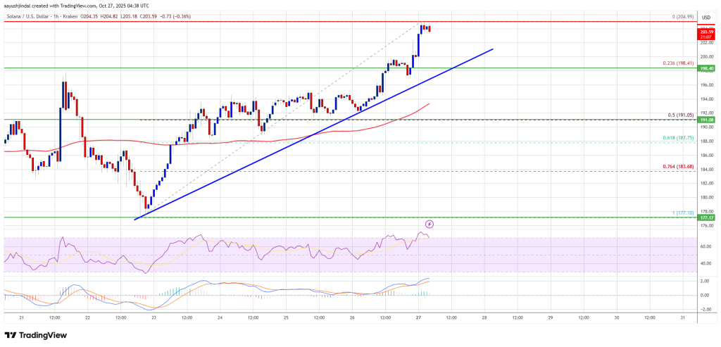 Solana is now trading above $200 and the 100-hourly simple moving average. Besides, there is a bullish trend line forming with support at $198 on the hourly chart of the SOL/USD pair.