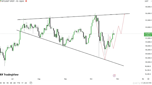 According to the analyst, Bitcoin is likely to retrace toward the $108,000–$110,000 range, an area identified as a key short-term support zone. This range could serve as a healthy reset point for the market, allowing momentum indicators to cool down before the next potential upward leg begins.