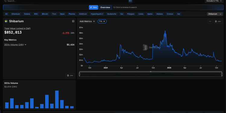 According to data from DeFi Llama, Shibarium has only 18 developers since it began. It is a much lower number than on other blockchains, which have hundreds or even thousands of active developers. The total value locked (TVL) on the network, which shows how much money people have invested in it, has fallen to just $878,000.