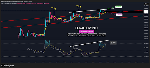 The chart from EGRAG CRYPTO shows that XRP has already broken above the midpoint of its long-term ascending parallel channel. The red trendlines framing the channel stretch back to 2014, and XRP’s breakout above the resistance line shows that bullish momentum is comparable to that of the 2017/2018 rally.