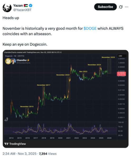 The analyst cited similar growth in 2017, 2020, 2022, and 2024. With November just beginning, there’s plenty of potential for $DOGE to make a repeat performance and usher in a major rally for altcoins.