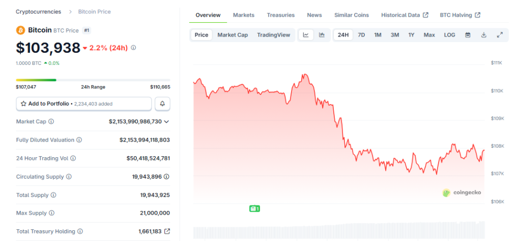 Bitcoin’s pullback on Monday sent a quick chill through crypto markets, pulling sentiment down to levels not seen in months. Prices dipped to a 24-hour low of $103,938 after earlier trading above $109,000, and gauges of market mood turned sharply negative as investors reassessed risk.