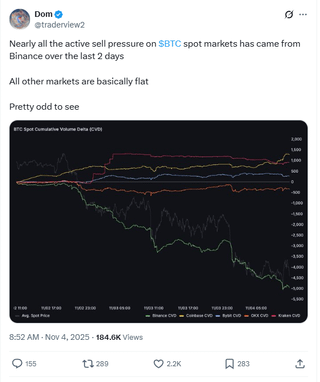 Something appears to be going on at Binance – the majority of BTC spot sales are initiating out of Binance in the last two days.