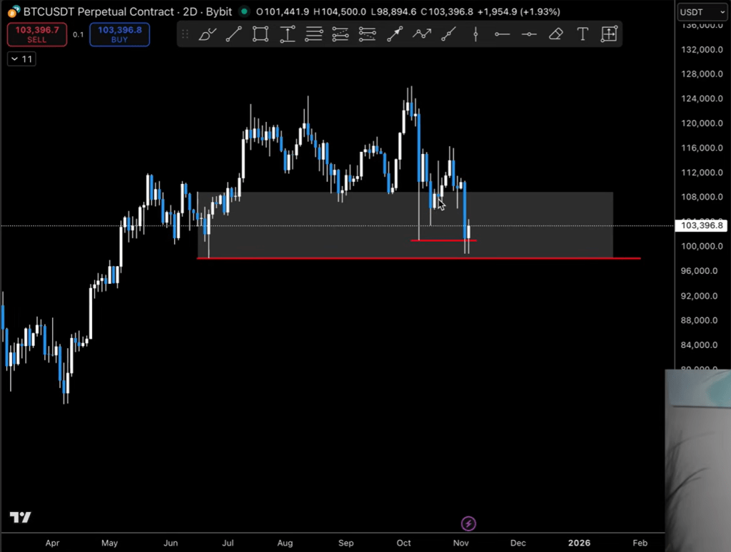 He wants to see “time and space away from this low” and a reclaim of the monthly open around $110,000–$112,000 to confirm that the decline has been exhausted. If that structure forms, he intends to treat $98,000 as the operative bull-market invalidation on a weekly-closing basis: “That will confirm to me that this is our bull market invalidation… at least in the worst case you have a cut point at like $100k Bitcoin.”
