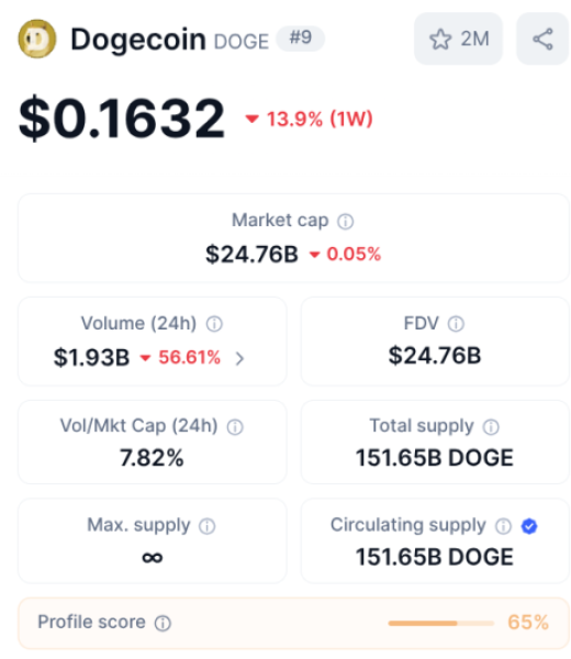 As of now, $DOGE trades near $0.163, supported by a $24.7B market cap and a circulating supply of roughly 151B coins, numbers that keep it firmly in the top tier of crypto’s most watched assets.