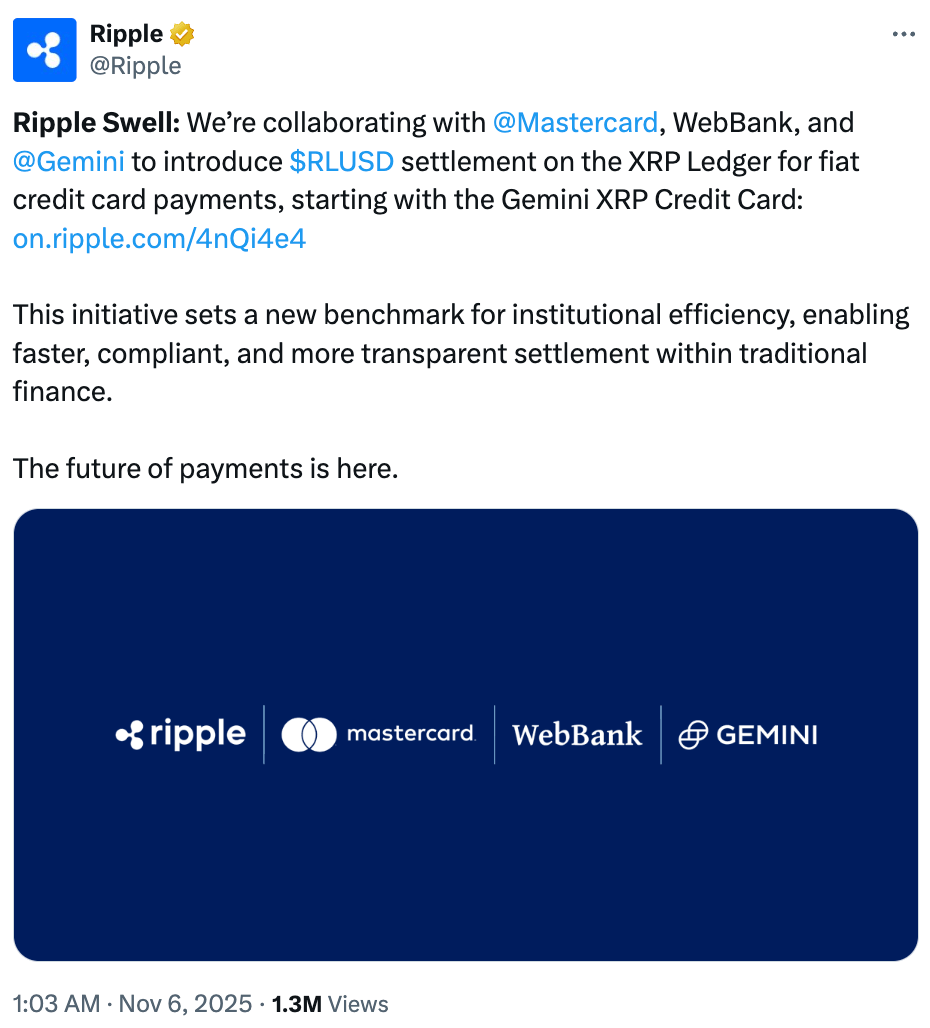 Ripple announced a partnership with Mastercard, WebBank, and Gemini, which would introduce settlement of its $RLUSD stablecoin for fiat credit card payments.