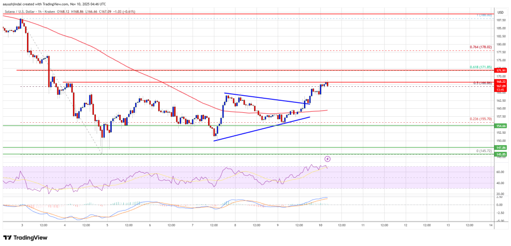 Solana is now trading above $162 and the 100-hourly simple moving average. On the upside, immediate resistance is near the $168 level. The next major resistance is near the $172 level or the 61.8% Fib retracement level of the downward move from the $188 swing high to the $145 low.
