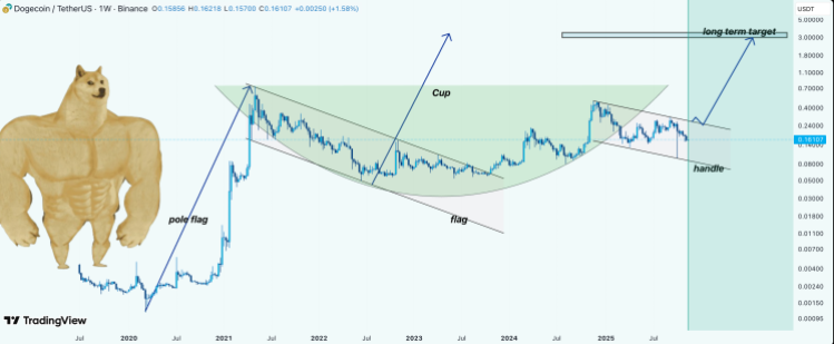 Interestingly, the formation of the macro cup and handle pattern didn’t just start recently, as is usually the case. The crypto analyst explains that this formation had begun years ago, back in 2021, when the Dogecoin price had staged its legendary 36,000% rally that pushed it to new all-time highs.
