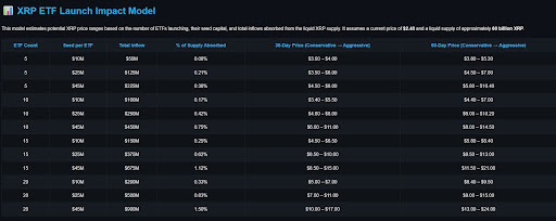 Diana’s newly released “XRP ETF Launch Impact Model” outlines a clear, data-driven view on how ETF inflows alone could reprice XRP. Her framework tests multiple launch scenarios involving five to twenty ETFs, each seeded with $10 million to $45 million. Depending on the scale, total inflows range from $50 million to $900 million, absorbing between 0.08% and 1.50% of XRP’s estimated 60-billion-unit liquid supply.