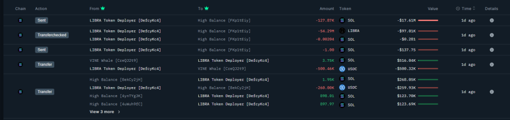 Based on on-chain data, two addresses tied to the Libra project — labeled “Libra Deployer (Defcy)” and “Libra Wallet (61yKS)” — bought about $61.5 million worth of SOL at an average price near $135.