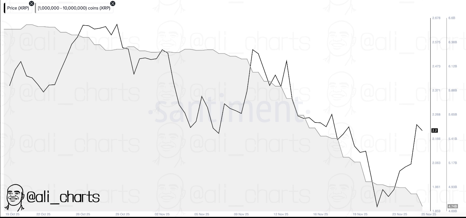 Meanwhile, analyst Ali Martinez said larger holders have been taking profits during the rebound. Whales holding between 1 million and 10 million XRP reportedly sold over 180 million tokens, trimming their balances to about 4.74 billion XRP. That kind of selling can add pressure even while the price is trying to recover.
