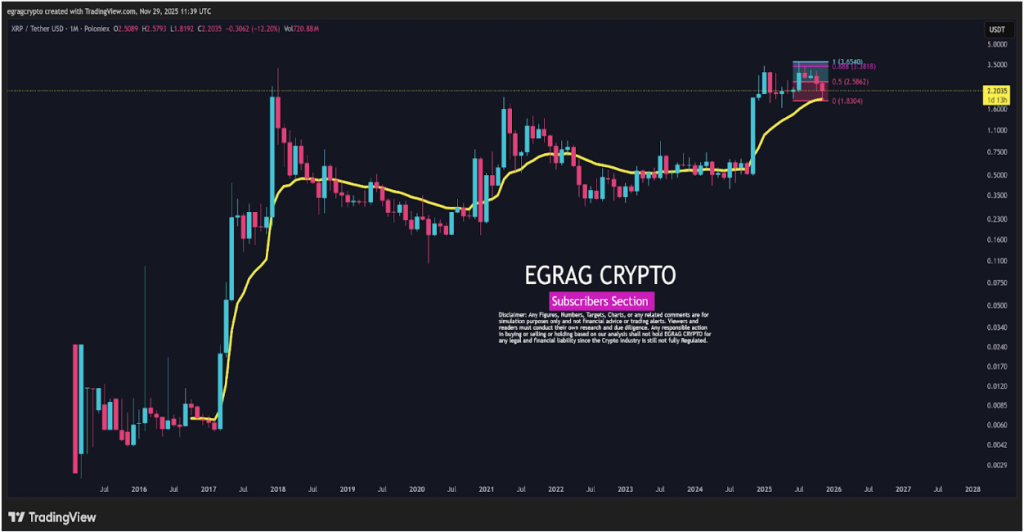 Egrag’s first decisive level is at $2.60, which matches with the 0.5 Fibonacci retracement level on the monthly chart. The analyst described a close above this region as bullish but the asset would not yet be fully clear of danger. The chart shows XRP repeatedly testing this price level in the first half of the year before breaking above it in July. However, the most recent breakdown in Q2 2025 has now put the price level in focus again.