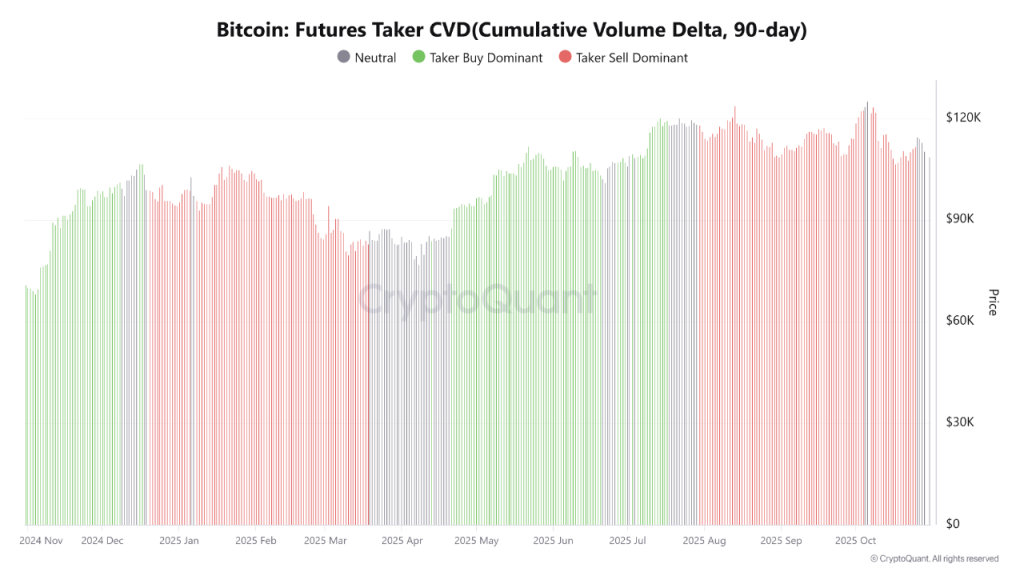 While Bitcoin’s price action points to a relative scarcity of spot activity, recent on-chain data reveals an increasingly dynamic atmosphere within its futures market, especially on the Binance network. Related Reading: Bitcoin October Slump: Fourth Worst On Record Since 2013, Per Fortune Analysis Binance Dominates Futures Market As Trader Sentiment Sees Structural Shift In a recent post on the CryptoQuant platform, crypto education institution XWIN Research Japan shares insights into developments in the Bitcoin futures market, with their key focus being the Binance network. According to the research institution, the world’s leading crypto exchange is maintaining its reputation after reaching its record high of $1.88 trillion in trading volume. At the same time, the trader sentiment within Bitcoin’s futures market evidently appears to be undergoing a transition, with data from the Bitcoin: Futures Taker CVD (Cumulative Volume Delta, 90-Day) informing the supposition. For context, this metric tracks the net difference between taker buy volume and taker sell volume over 90 days, revealing if the traders in the futures market are predominantly adding to its buying pressure or contributing to its selling pressure. XWIN Research points out that as of the middle of 2025, Bitcoin’s taker buy volume dominated the futures market, as most traders accumulated positions. This period of accumulation, notes the analyst, was seen as the flagship cryptocurrency climbed above $100,000. However, from late August to the present, there has been a re-emergence of taker sell pressure, signaling the predominance of profit takers in the market. Related Reading: Ethereum Support Band Under Pressure — Can Bulls Revive Momentum From $3,700? What This Means For Price Contrary to what this structural shift might be interpreted as, the educational institution explains that the market seems instead to be becoming more mature. A typical mature market, as XWIN Research points out, is one where the market participants manage their exposure, rather than chase any or all price spikes. The reappearance of taker sell pressure therefore signifies a growing inclination among traders to protect their gains nested within the $110,000-$115,000 price range. Historically, this kind of “moderation” has often been a sign of long-term strength. Binance’s $1.88 trillion in trading volume also lends credence to this view, as it reveals the presence of solid institutional confidence in the cryptocurrency’s long-term growth. Aside from institutional backing, this trading volume also puts into perspective the width of global participation in the Bitcoin derivatives market. In the long run, the Bitcoin market could be in the early phases of a sustained and long-lasting expansion. At press time, Bitcoin is worth approximately $110,110. The premier cryptocurrency shows a slight growth of 0.40% in 24 hours. Also reflecting the online asset’s sideways movement is its net loss of 1.36% over the past seven days. Featured image from iStock, chart from Tradingview