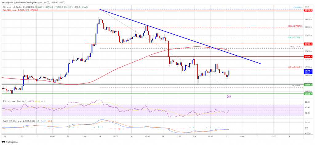 Bitcoin price is consolidating above the $26,500 support. BTC could decline heavily if there is a clear move below the $26,500 support. Bitcoin is still struggling to stay above the $26,500 support zone. The price is trading below $27,250 and the 100 hourly Simple moving average. There is a key bearish trend line forming with resistance near $27,220 on the hourly chart of the BTC/USD pair (data feed from Kraken). The pair could correct higher, but upsides might be contained above the $27,500 resistance. Bitcoin Price Holds Support Bitcoin price remained in a bearish zone below the $27,500 resistance zone. BTC failed to recover and started another decline below $27,000. There was a spike below the $26,550 support zone but the bulls were active near $26,500. A low is formed near $26,500 and the price is now consolidating losses. It is testing the 23.6% Fib retracement level of the main drop from the $28,450 swing high to the $26,500 low. Bitcoin price is now trading below $27,250 and the 100 hourly Simple moving average. There is also a key bearish trend line forming with resistance near $27,220 on the hourly chart of the BTC/USD pair. Immediate resistance on the upside is near the $27,000 level and the trend line. The next major resistance is near the $27,500 level and the 100 hourly Simple moving average. It is close to the 50% Fib retracement level of the main drop from the $28,450 swing high to the $26,500 low. Source: BTCUSD on TradingView.com An upside break and close above $27,500 could start a decent increase toward $28,000. Any more gains above the $28,000 resistance zone might send the price toward the $28,500 resistance zone or even $29,200. More Losses in BTC? If Bitcoin’s price fails to clear the $27,200 resistance, it could continue to move down. Immediate support on the downside is near the $26,560 level. The next major support is near the $26,500 zone, below which the price might start a strong decline. In the stated case, the price could drop toward the $25,500 support in the coming sessions. Technical indicators: Hourly MACD – The MACD is now losing pace in the bearish zone. Hourly RSI (Relative Strength Index) – The RSI for BTC/USD is below the 50 level. Major Support Levels – $26,550, followed by $26,500. Major Resistance Levels – $27,200, $27,400, and $27,500.