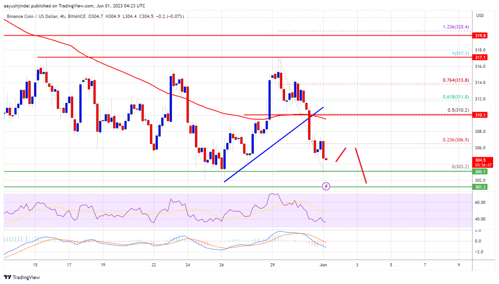 BNB price (Binance coin) is moving lower below the $310 support against the US Dollar. The bears could gain strength if there is a close below $300. Binance coin price is moving lower from the $318 resistance against the US Dollar. The price is now trading below $310 and the 100 simple moving average (4 hours). There was a break below a key bullish trend line with support near $310 on the 4-hour chart of the BNB/USD pair (data source from Binance). The pair could accelerate lower if it breaks the $300 support zone. Binance Coin Price Tops Again This past week, BNB price attempted an upside break above the $318 resistance. However, the bulls struggled to gain strength above $318, similar to Bitcoin and Ethereum. A high is formed near $317.1 and the price started a fresh decline. There was a clear move below the $312 and $310 levels. There was also a break below a key bullish trend line with support near $310 on the 4-hour chart of the BNB/USD pair. BNB price is now trading below $310 and the 100 simple moving average (4 hours). A low is formed near $303.2 and the price is now consolidating losses. On the upside, BNB is facing resistance near the $306.5 level. It is close to the 23.6% Fib retracement level of the downward move from the $317.1 swing high to the $303.2 low. The first major resistance is near $310 and the 100 simple moving average (4 hours). Source: BNBUSD on TradingView.com It is close to the 50% Fib retracement level of the downward move from the $317.1 swing high to the $303.2 low. The next major resistance is near $315. A clear move above the $315 resistance might start a steady increase. The next major resistance is near the $318 level, above which the price might rise toward the $325 resistance. More Losses in BNB? If BNB fails to clear the $310 resistance, it could continue to move down. Initial support on the downside is near the $303 level. The next major support is near the $300 level. If there is a downside break below the $300 support, there could be an extended decline toward the $292 support. Any more losses could send the price toward the $284 support. Technical Indicators 4-Hours MACD – The MACD for BNB/USD is gaining pace in the bearish zone. 4-Hours RSI (Relative Strength Index) – The RSI for BNB/USD is currently below the 50 level. Major Support Levels – $303, $300, and $284. Major Resistance Levels – $307, $310, and $315.