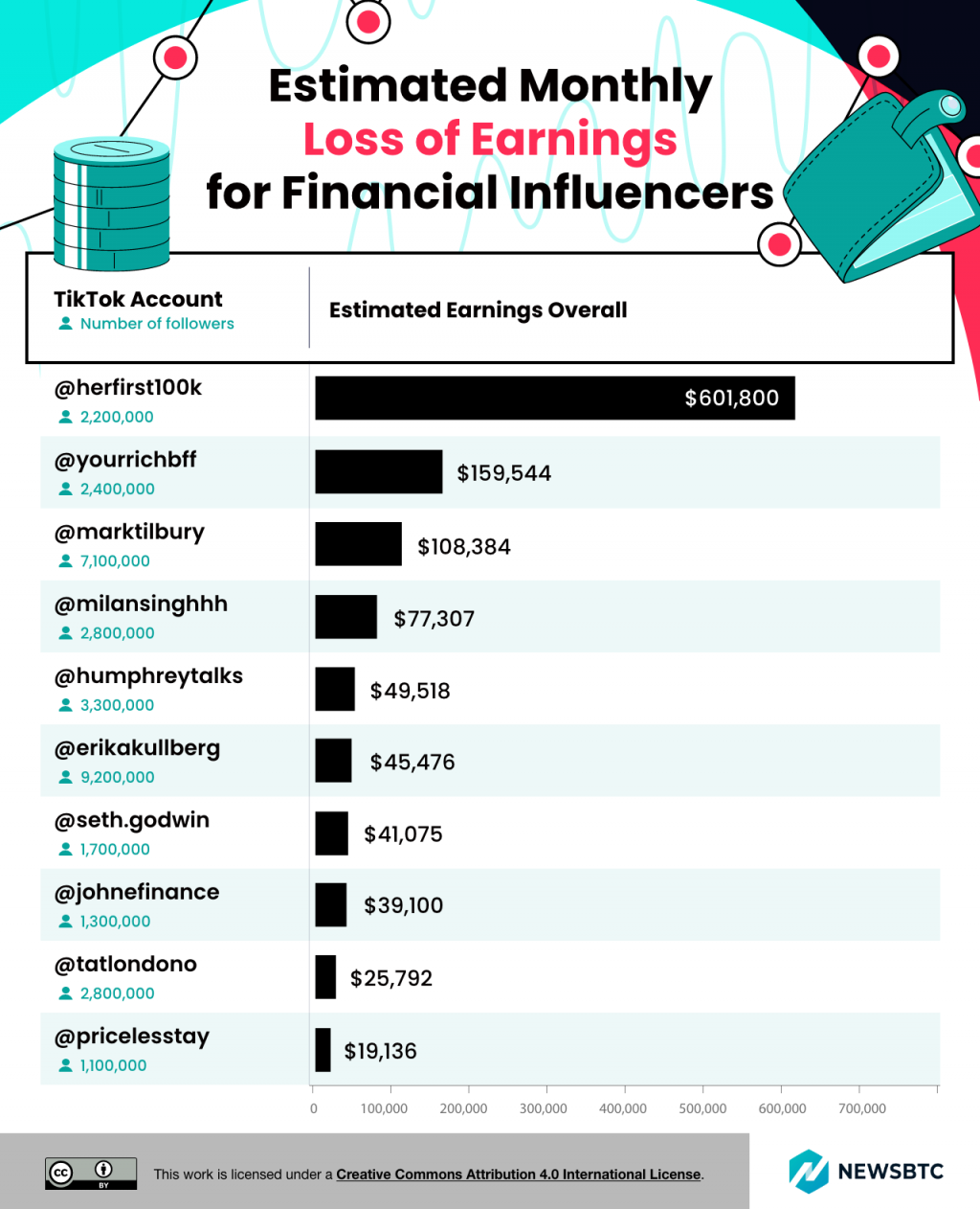 TikTok has been in the news recently as the U.S. wants to ban the app over fears of the Chinese government using it for surveillance, with Montana being the first state to officially ban the app. With 150 million Americans using TikTok, a blanket ban of the app could have a large impact on people’s livelihoods, especially those who rely TikTok for income. At NewsBTC we wanted to analyze some of the biggest crypto and financial influencers on the platform to find out what they could potentially lose if TikTok is banned in the U.S.A. TikTok Financial Influencers Potential Monthly Loss From our seed list the financial influencer who could have the biggest loss in earnings is Tori Dunlap or @herfirst100k on TikTok. Dunlap has 2.2 million followers on TikTok and we estimate she could lose over $600k a month if TikTok is banned. Another influencer who could see a massive loss in earnings is Vivian Tu or @yourrichbff on TikTok. With 2.4 million followers Tu is estimated to have a potential earning loss of almost $160k a month. Mark Tilbury – @marktilbury – is also set to lose a massive $108k a month if TikTok is banned. TikTok Crypto Influencers Potential Monthly Loss From our list of crypto influencers the influencer who could have the biggest loss in earnings is Mason Verslius @cryptomasun on TikTok. According to our research he could lose over $61k a month if a ban is put in place. The crypto influencer who could face the second largest loss in earnings is @cryptowendyo, who could lose just under $60k a month. Lucas Dimos – @theblockchainboy – is third on our list with a potential monthly loss of over $31k. TikTok Financial Influencers Total Earnings Estimated earnings are based on the number of videos an influencer posts and their engagement rate. Therefore, for some of the larger influencers analyzed, the TikTok ban is estimated to have less impact. For example, Erika Kaulberg – @erikakullberg – has 9.2 million followers but is 6th on our list for total earnings at $1.09 million and estimated to lose $45k a month. TikTok Crypto Influencer Total Earnings From our list of crypto influencers @cryptoprojects has the biggest following of 1.4 million with estimated total earnings of $106k putting him at 7th on our list of top earners. Just above @cryptoprojects is @nft.degen, the second largest crypto influencer on our list with 1.3 million followers. His estimated total earnings are just $124k, making his estimated monthly earning loss $5.6k. Methodology NewsBTC analyzed the biggest Finance and Crypto influencers on TikTok to find out what their potential monthly loss of earnings could be if TikTok is banned in the U.S.A. A list of the top 50 influencers was collated by merging a list of ‘best crypto currency influencers’ from the top Google results. NewsBTC did this by calculating what the estimated total earnings are for top crypto and financial influencers, and dividing that by the number of months they had been active on the platform. Total earnings were calculated using the TikTok Money Calculator on Influencer Marketing Hub which takes the number of videos and engagement rate into account when providing earning estimations.
