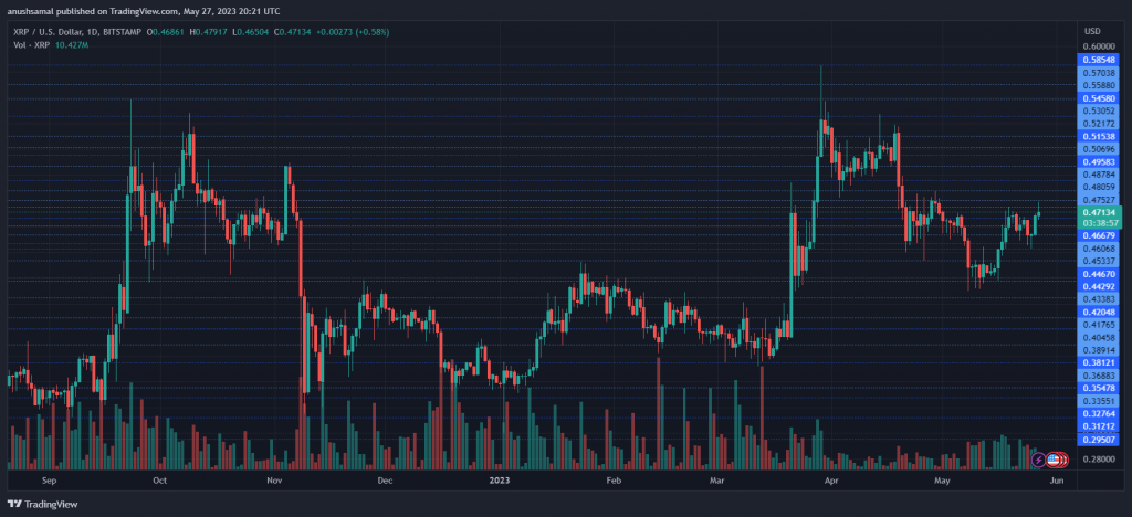 XRP has shown recent gains on its price chart, allowing the altcoin to surpass a significant resistance level. Although the 1% increase over the past 24 hours may not be substantial, it has helped maintain bullish momentum. However, on a weekly chart, XRP has experienced minimal movement. Despite this, the technical outlook for the coin indicates bullish strength in the market. Buying strength has risen, and both demand and accumulation have turned positive, contributing to this technical outlook. The performance of XRP on its chart may be influenced by the movement of Bitcoin. Related Reading: Bullish Case For Litecoin Grows Stronger As LTC Halving Draws Close If Bitcoin continues to appreciate and reaches the $27,000 range, XRP may attempt to break through its immediate resistance. With buying strength recovering and demand potentially supporting the bulls, their position in the market could strengthen. However, if the price remains stagnant at its current level, demand might start to decline, causing the bulls to lose momentum. The increase in the altcoin’s market capitalization over the past 24 hours suggests that buyers have gained control over sellers. XRP Price Analysis: One-Day Chart At the time of writing, XRP was trading at $0.47. In recent trading sessions, the altcoin successfully surpassed the resistance level of $0.45. Sustaining this positive momentum, the next resistance level for XRP is expected to be at $0.48. If this level is cleared, it could fuel a rally towards the $0.50 mark. However, if the price retreats from its current level, it may invite bearish pressure, potentially causing the price to settle around $0.43. Notably, the volume of XRP traded in the last session was relatively high, indicating a lower selling strength in the market. Technical Analysis During the recent trading sessions, the altcoin not only made progress in its price movement but also saw a notable recovery in buying strength. The Relative Strength Index (RSI) being above the half-line suggests that buyers have taken control of the price action in the market. Additionally, XRP moved above the 20-Simple Moving Average (SMA) line, indicating that buyers were driving the price momentum. This shift in momentum was supported by an increased demand for XRP in the market. In line with other technical indicators, the altcoin has started to exhibit buy signals on the chart. The Moving Average Convergence Divergence (MACD), a tool used to assess price momentum and potential reversals, displayed green histograms associated with buy signals. This suggests that there is a possibility of the altcoin attempting to break through its overhead resistance level. Related Reading: When Is A Token Coming For Coinbase’s Base L2? Here’s What The Roadmap Says Furthermore, the Bollinger Bands, which indicate price volatility and fluctuations, remained parallel and wide. This indicates that the XRP price action is not expected to be constricted or range-bound. The upper band of the Bollinger Bands intersected at $0.48, highlighting this level as an important resistance level or price ceiling for the altcoin to overcome. -Featured Image From iStock, Charts From TradingView.com