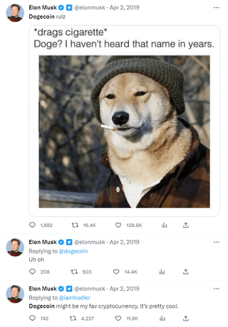 He first started trying to slowly bring it up to his Twitter followers on April 2, 2019. Probably he schemed an idea to buy shitload of Doge and then try to bring it back to mainstream to his cult fanboys and make shitload of money that way if price increases incredibly because of it. He…