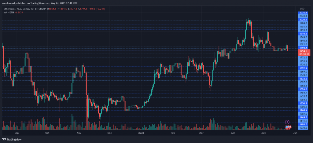 Ethereum started the week with a promising performance, experiencing a gain of over 3%. However, the bullish momentum was short-lived as the altcoin failed to sustain its position above a key resistance level. Within the past 24 hours, ETH’s market value has declined by nearly 3%. Throughout the week, the ETH price has shown limited progress, with the bears dominating the price movement. The altcoin’s technical outlook indicates a decline in buying strength, accompanied by low demand and accumulation on the daily chart. Related Reading: Ethereum Staking Hits Over $40 Billion After Shanghai Upgrade: What It Means For ETH To prevent further strengthening of the bears, it is crucial for Ethereum to surpass its immediate resistance in the upcoming trading sessions. Failure to do so may lead to additional pressure from sellers, potentially causing Ethereum to breach its immediate support level and experience a significant loss in value during future trading sessions. Additionally, the fall in the ETH market capitalization suggests an increase in selling strength, as observed on the daily chart. Ethereum Price Analysis: One-Day Chart At the time of writing, the trading price of ETH was $1790. Despite attempting to trade within the $1800 price range, the altcoin encountered selling pressure, resulting in its depreciation. The current overhead resistance for Ethereum is $1810. If the altcoin surpasses this resistance level, it has the potential to trigger a rally in its price. On the other hand, if the present price level experiences a decline, Ethereum is likely to decline further to $1750 before eventually reaching the $1700 price mark. The recent session saw a decrease in the volume of Ethereum traded, indicated by the red colour, indicating a weak buying strength. Technical Analysis Throughout this month, Ethereum experienced a decline in demand, resulting in reduced buying strength. The Relative Strength Index (RSI) dropped below the midpoint line, suggesting a decrease in demand and an increase in selling pressure on the chart. Additionally, the price of Ethereum fell below the 20-Simple Moving Average (SMA), indicating that sellers were dominating the market’s price momentum. Given that Bitcoin’s price movement remains uncertain, several altcoins, including Ethereum, have followed a similar price trajectory. However, if Ethereum gains broader market strength, there is a possibility that demand could return, causing ETH to surpass the 20-SMA line and potentially climb higher. Due to the absence of demand, ETH did not exhibit significant buy signals. The Moving Average Convergence Divergence (MACD), a tool used to indicate price momentum and potential trend reversals, showed small green histograms that do not provide conclusive buy signals at this point. The Bollinger Bands, which measure price volatility and potential fluctuations, have maintained a parallel shape. However, they displayed slight convergence, suggesting that ETH may trade within a relatively stable range without substantial price fluctuations. Related Reading: Bitfinex And Crypto Bank OrionX Forged Partnership To Broaden Presence In Latin America To reclaim the $1800 price level, it is crucial for buyers to re-enter the market at the current price level. Their participation is essential for Ethereum to regain strength and potentially push the price higher. Featured Image From UnSplash, Charts From TradingView.com