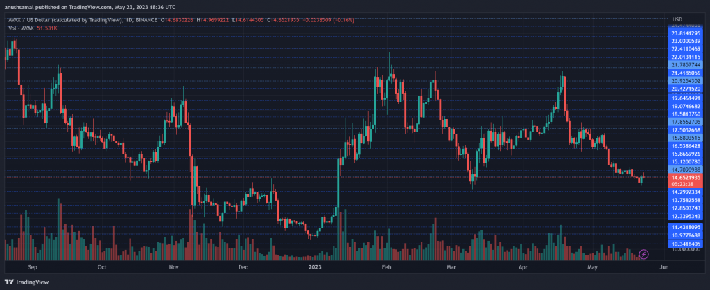 During the recent weekend, Avalanche (AVAX) witnessed a significant surge in selling pressure, resulting in a bearish breakout. As a consequence, the price of AVAX dipped close to a multi-month low of $13.8. However, on the 24-hour chart, the altcoin displayed a slight upward movement, showing some appreciation. On the other hand, the weekly chart depicted lacklustre performance for AVAX. The technical outlook for Avalanche remains bearish, as both demand and accumulation levels have remained low. The price action of AVAX has been influenced by the undecided nature of Bitcoin (BTC), which recently re-entered the $27,000 range. Related Reading: XRP Aims For $0.50, Hinges on Breaking Through This Price Level This has caused other altcoins, including AVAX, to exhibit uncertainty on their respective charts. The overhead resistance level for AVAX holds significant importance, as surpassing this level could trigger a rally for the altcoin. Conversely, if sellers exert further pressure, AVAX may break its consolidation and fall below its immediate support level, thereby strengthening the bearish sentiment. Broader market strength is necessary for AVAX to reclaim its overhead ceiling. The decline in the market capitalization of AVAX indicates a decrease in buying strength at the current time. Avalanche Price Analysis: One-Day Chart At the time of writing, AVAX was priced at $14.70. It is currently trading in close proximity to its immediate resistance level of $15. A breakthrough above $15 has the potential to propel the altcoin towards $15.80 and ultimately $16. The involvement of buyers in the market is crucial to generate demand and facilitate AVAX’s upward price movement. On the downside, if AVAX fails to sustain its current price level, it may find support at $14 before potentially trading below that level. The recent trading session showed a decline in the amount of AVAX traded, indicating the dominance of sellers in the market. Technical Analysis Throughout May and part of April, AVAX experienced consistently low buying pressure, reflecting a limited demand for the altcoin. The Relative Strength Index (RSI) was below the 40-mark, indicating that sellers had a greater presence than buyers at the time of writing. Furthermore, the AVAX price fell below the 20-Simple Moving Average (20-SMA) line, demonstrating that sellers were the driving force behind the price momentum in the market. A significant move above the $15 price level would help AVAX surpass the 20-SMA line, suggesting a potential shift in momentum and possibly attracting more buying interest. Although AVAX recently returned to the $14 price zone, there are no clear indications of buying strength according to technical indicators. The Moving Average Convergence Divergence (MACD), provides insights into price momentum. It formed only one green histogram, which does not necessarily signify buy signals at this point. Related Reading: Litecoin Surpasses $90, But This Level Remains Crucial For The Altcoin The Bollinger Bands, which reflect price volatility and fluctuations, have remained wide, indicating that the possibility of price fluctuations cannot be ruled out in the upcoming trading sessions. Featured Image From UnSplash, Charts From TradingView.com