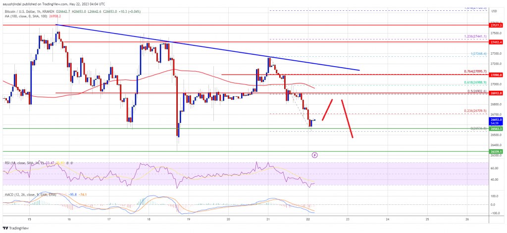 Bitcoin price is holding the key $26,550 support zone. BTC could start a major decline if there is a close below $26,550 and $26,400. Bitcoin started another decline and traded below the $26,850 level. The price is trading below $27,000 and the 100 hourly Simple moving average. There is a major bearish trend line forming with resistance near $27,120 on the hourly chart of the BTC/USD pair (data feed from Kraken). The pair could gain bearish momentum if there is a daily close below $26,550. Bitcoin Price Remains In A Range Bitcoin price started a fresh decline below the $27,000 level. BTC traded below the $26,800 support zone and trimmed most of its gains. However, the bulls were active near the $26,550 support. A low is formed near $26,536 and the price is now consolidating losses. It is clearly showing bearish signs below $27,000 and the 100 hourly Simple moving average. There is also a major bearish trend line forming with resistance near $27,120 on the hourly chart of the BTC/USD pair. Bitcoin price is now facing resistance near the $26,720 level. It is close to the 23.6% Fib retracement level of the recent decline from the $27,268 swing high to the $26,536 low. The next major resistance is near the $27,000 level and the 100 hourly Simple moving average. It is close to the 61.8% Fib retracement level of the recent decline from the $27,268 swing high to the $26,536 low. The first major resistance is near the trend line. Source: BTCUSD on TradingView.com A close above the $27,120 resistance might reduce selling pressure. The next key resistance is near $27,550, above which the price might start a decent increase toward the $28,000 resistance. Any more gains might send the price toward the $28,500 level. More Losses in BTC? If Bitcoin’s price fails to clear the $27,120 resistance, it could continue to move down. Immediate support on the downside is near the $26,550 level. The next major support is near the $26,350 zone, below which the price might gain bearish momentum. In the stated case, it could test the $25,800 level. Any more losses might take Bitcoin toward the $25,500 level in the near term. Technical indicators: Hourly MACD – The MACD is now gaining pace in the bearish zone. Hourly RSI (Relative Strength Index) – The RSI for BTC/USD is now below the 50 level. Major Support Levels – $26,550, followed by $26,350. Major Resistance Levels – $27,000, $27,120, and $27,500.
