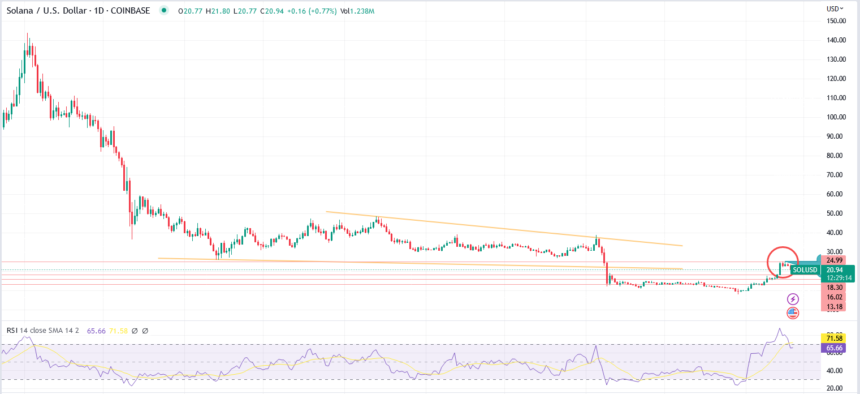 Solana native token SOL has been on a tear since the start of the year. But the token might be on its way to test its support as it faces rejection. Recent on-chain developments contributed to Solana’s climb. But with the rejection, can SOL regain its bullishness? Related Reading: LUNC Network Upgrade Backed By Major Exchanges – Will The Crypto Balloon In Price? Solana Keeps Things Aglow The Solana ecosystem is touted as an “Ethereum killer” as it rose in prominence due to its low transaction fees and its capability to go through thousands of transactions per second. Sam Bankman-Fried, former CEO of the now-defunct crypto exchange FTX, called the ecosystem “underrated” last year. This connection with SBF and FTX led to both the ecosystem and the token to take a plunge, losing nearly half of its value. SOL total market cap at $7.6 billion on the daily chart | Chart: TradingView.com Because of this, the team behind the network made efforts to distance itself from FTX and Bankman-Fried. The Messari overview which was commissioned by the Solana Foundation, detailed how things went down with regards the crypto exchange and its former big boss. Image: BONK/Twitter But during the turn of the year, SOL and other altcoins started rallying as major cryptocurrencies like Bitcoin and Ether broke through crucial resistances. And with the release of BONK during the rally, the network usage of SOL shot upwards, adding on to the already solid trajectory that SOL has. Source: Alchemy Despite the fear, uncertainty, and doubt that plagued the ecosystem, Solana is still considered as a fast growing ecosystem, according to a recent report, which shows that the development on the network is increasing compared to its competitors. 1/ A new report by @ElectricCapital shows that Solana is the fastest growing developer ecosystem, surpassing 2,000 total developers in 2022. It’s second in raw numbers only to Ethereum. Let’s dig into the numbers.https://t.co/HQvPbQzQD2 pic.twitter.com/xV6pnoT7db — Solana (@solana) January 17, 2023 This certainly had an effect on SOL’s price. At the time of writing, SOL is trading at $20.63, up 30% in the last seven days. Rejection Line And What It Means Meanwhile, the token was rejected at $25, which could mean that bears will be able to test the two support levels that helped SOL reach its peak price. In the next few days, SOL is seen retesting the $18 and $16 supports. Chart: TradingView.com Related Reading: XRP Bulls Aim For $1 As Crypto Advances With 12% Weekly Pump SOL’s bullish pace in the weekly timeframe would certainly have an effect on the token’s ability to recover from the rejection. Although it is highly likely that the $18 support will break, investors and traders can rely on $16 as a launching pad to retest $25 in the coming days or weeks. If $25 is broken, $30 should be the next target as a breakthrough in this area would give SOL bulls legroom for more upward movement. SOL can rely on a solid ecosystem and a bullish community to recover lost ground. Featured image by Sunshine Adult Day Care